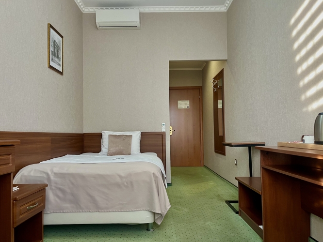 Этот номер — практичное решение для одноместного проживания, сочетающее в себе уют, функциональность и внимание к деталям.